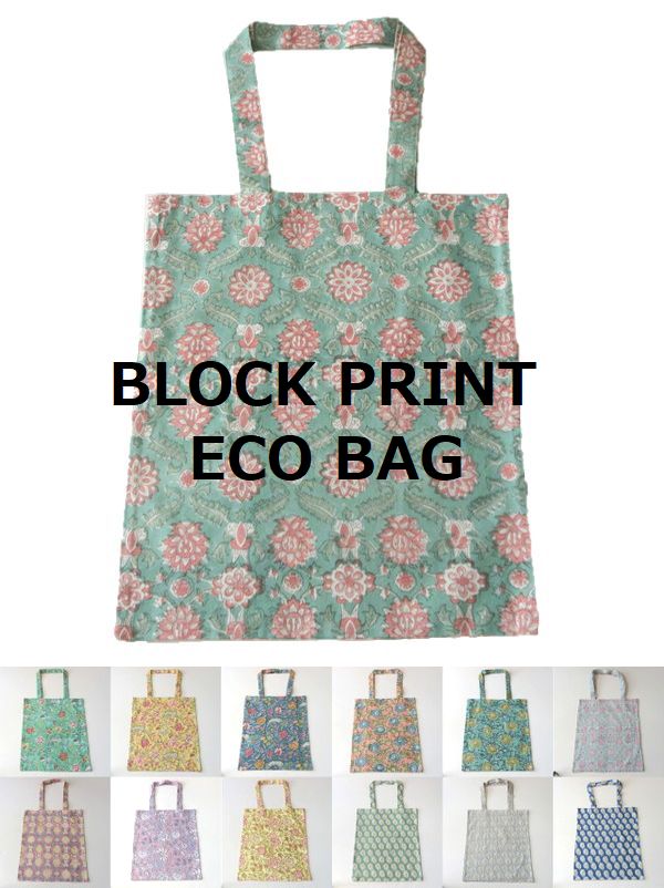 職人によるハンドメイドの木の型を使ったハンドメイドのブロックプリントをつくられたインド綿、プリントバッグ。色は、グリーンやライム、レッド、パープル、グレー、ピンクと色とりどりの15種類。