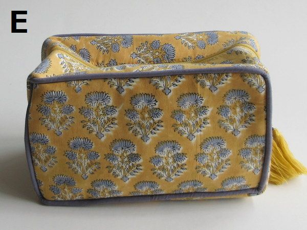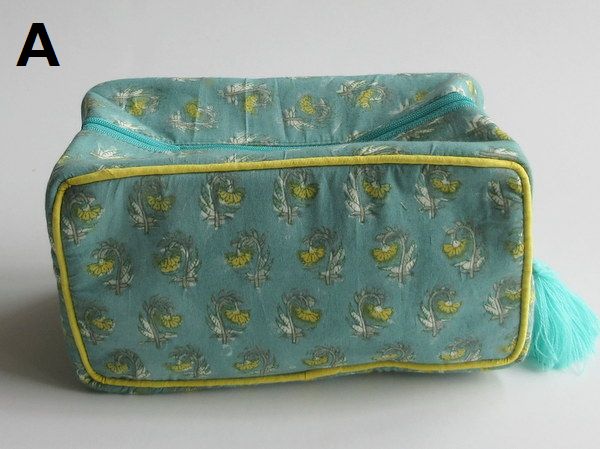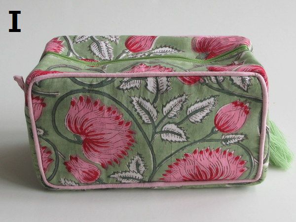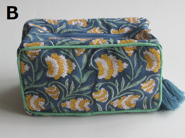 そのブロックプリントの手作りキルティングを使ったハイピングのスクェアの大きめポーチです。ジップ式で大きく開き、マチも広いので、化粧品や旅行の際の小物類など、なんでも入れてお使い頂けます。