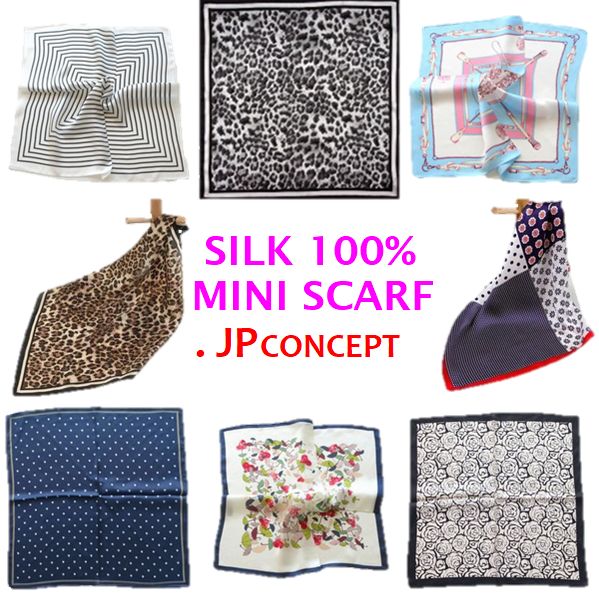 シルク100%のミニスカーフ。20種類の定番プリントのミニ スカーフです。サイズは、ちょっと大き目の53センチ×53センチの大きさで、高品質な厚みのある絹100%です。