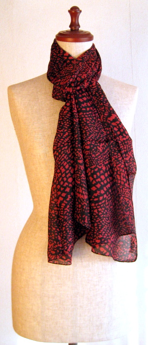 【シルクスカーフ】レッドのアニマルモチーフ/大判ストール/縦長/50センチ×180センチ★メール便対応