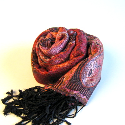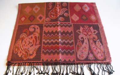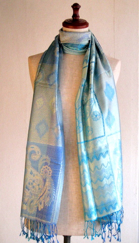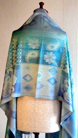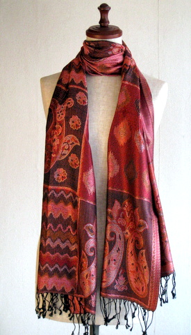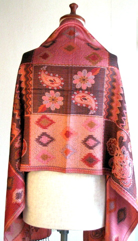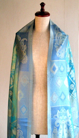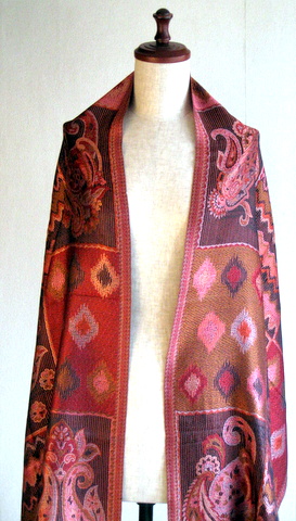 ペイズリーやの目のようなしずくのようなモチーフ、フラワーモチーフが織り込まれたジャガードストール。