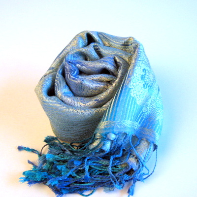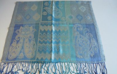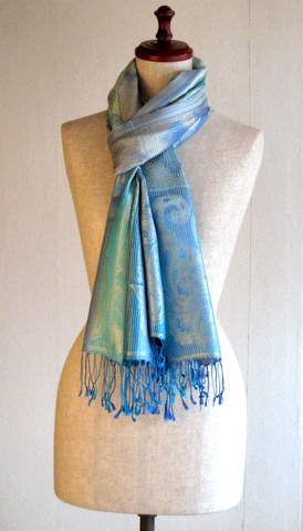56センチ×200センチのペイズリー模様と波型モチーフのストールはカジュアルにもエレガントにも