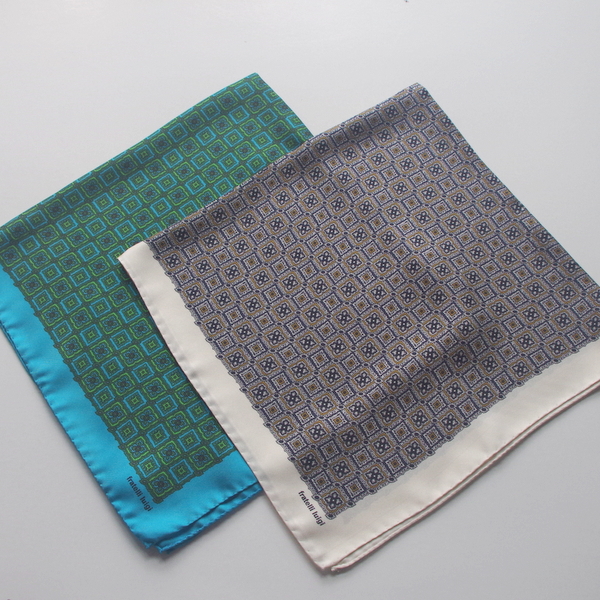 【FRATELLI LUIGI】フラテッリ ルイージの68センチ×68センチのバンダナサイズのシルク スカーフ。透けない厚みのある正方形のシルクスカーフ。小紋柄はクラッシックモチーフで、万能な柄です。イタリア製ならでは絶妙なデザイン、色使い、確かな縫製です。