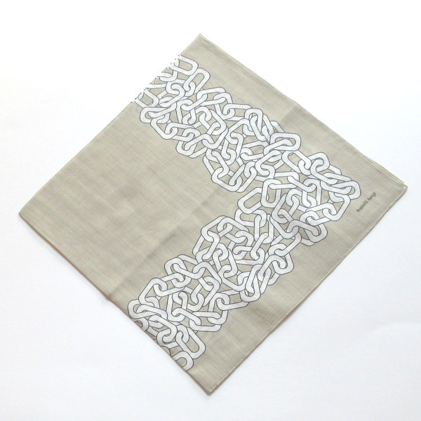 【FRATELLI LUIGI】フラテッリ ルイージの68センチ×68センチのバンダナサイズのコットンスカーフ。綿・麻・絹のナチュラル素材のバンダナスカーフは、程よい透け感があって、さらりとした肌触りです。からみあったチェーンのモチーフは、無地の物より、おしゃれに見えます。イタリア製ならでは絶妙なデザイン、色使い、確かな縫製です。