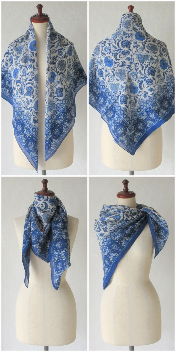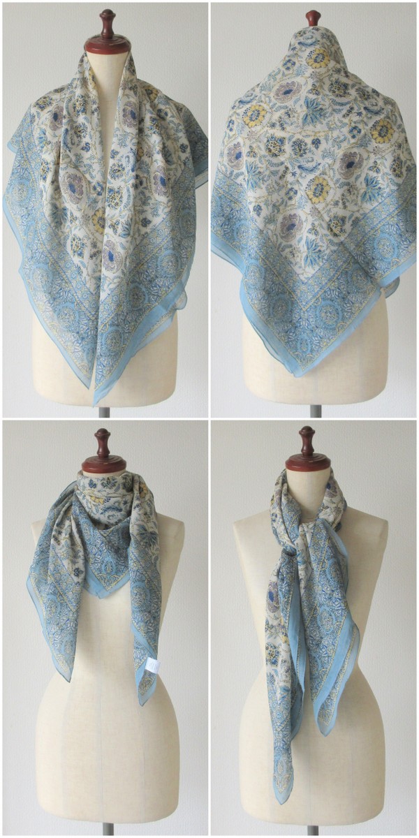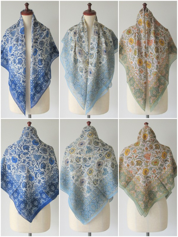 色は、3色。藍染めを思わせるネイビーとブルー、イエローと水色の涼しげな色使い。カーキグリーンとオレンジは夏らしい明るいコンビのスクエアのエスニック柄の大判ストール。