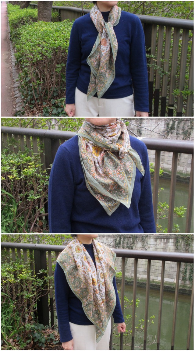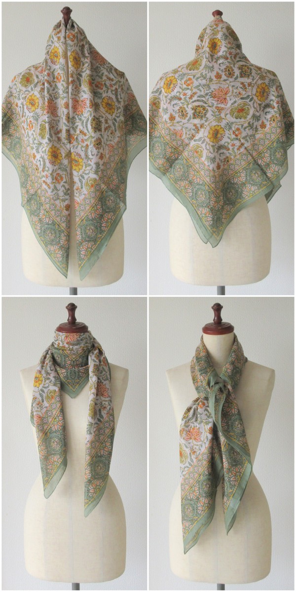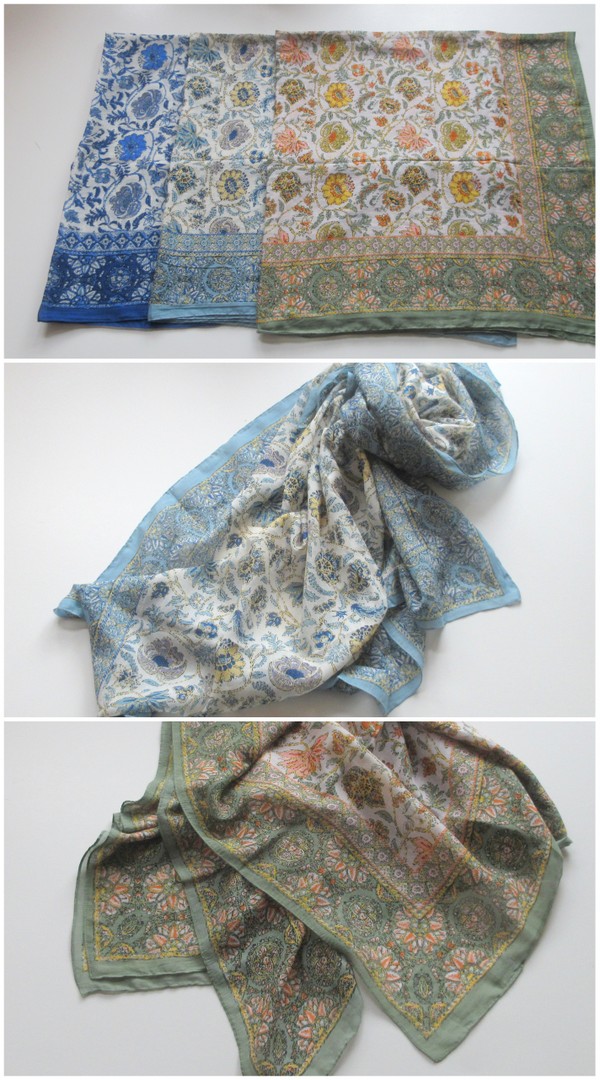 26年の春夏の新柄ストール、コットン100%の花柄・植物柄ストール、インド綿の大判スカーフ。綿100%なので、肌触りもさらりとしていて気持ちいいいですし、首にひと巻きするだけでおしゃれに見えます。春・夏・秋には手軽に手洗いできる、洗える素材は重宝しますね。