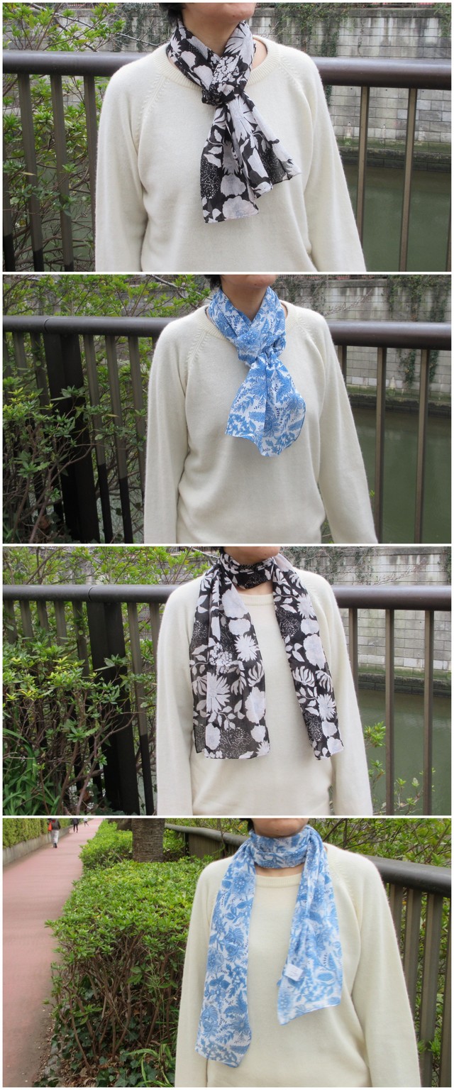 綿100%なので、肌触りもさらりとしていて気持ちいいいですし、首にひと巻きするだけでおしゃれに見えます。春夏には手軽に手洗いできる、洗える素材は重宝しますね。