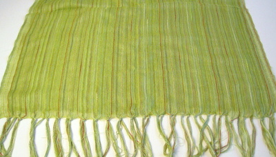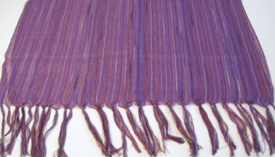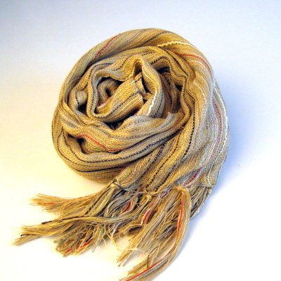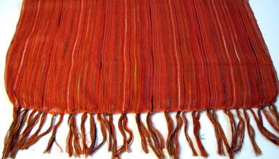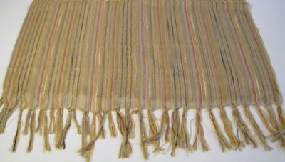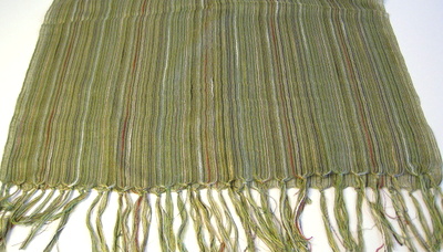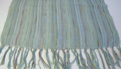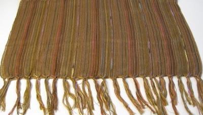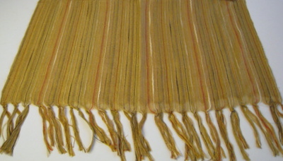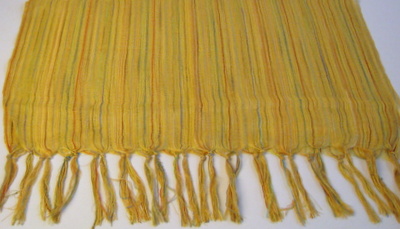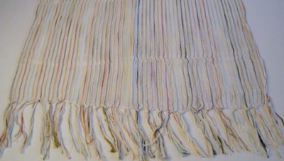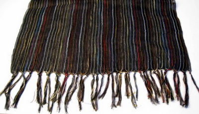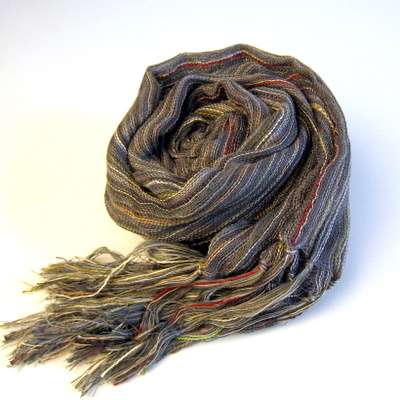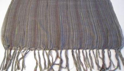 マルチカラーの縦糸に1色の横糸で織っていくことで、趣のあるハンドメイドのストライプストールが