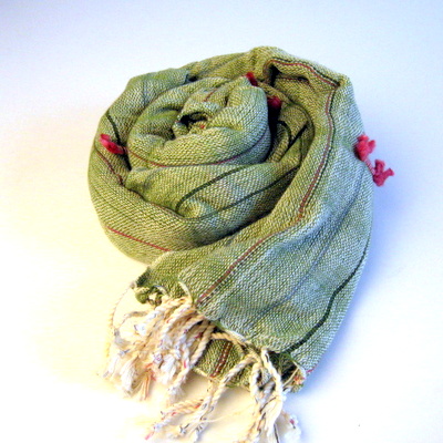 ハンドメイドのストライプの綿ストール。縦糸に生成りと何色かを数センチおきにいれストライプ模様のストール。