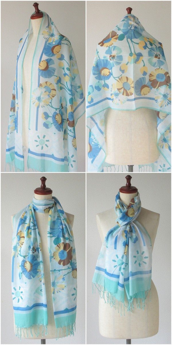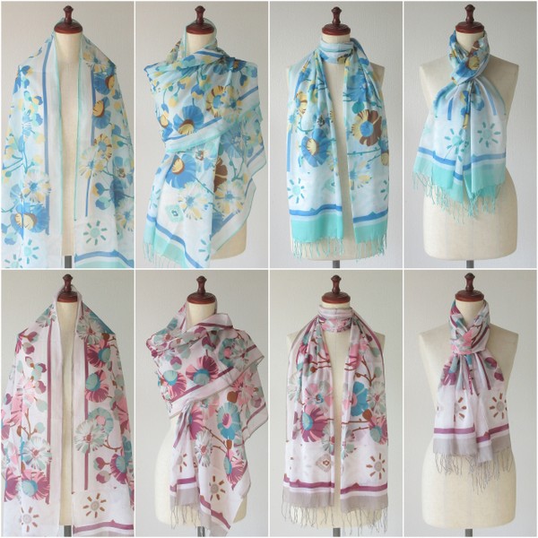 色は、さわやかなグリーン(エメラルド)に青や茶色、水色、黄色の大き目な花、グレーやワインレッドと落ち着いた 渋めなピンクの組み合わせ。巻くと花柄とは思えず、甘くなりすぎない大人のコーディネイトにおすすめの1枚です!