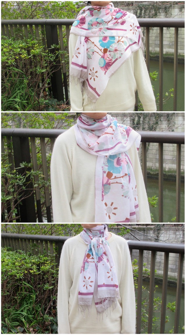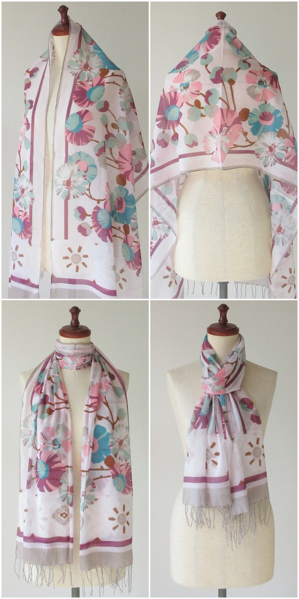 26年の春夏の新柄ストール、コットン100%の花柄・フラワー柄ストール、インド綿スカーフ。 綿100%なので、肌触りもさらりとしていて気持ちいいですし、首にひと巻きするだけでおしゃれに見えます。