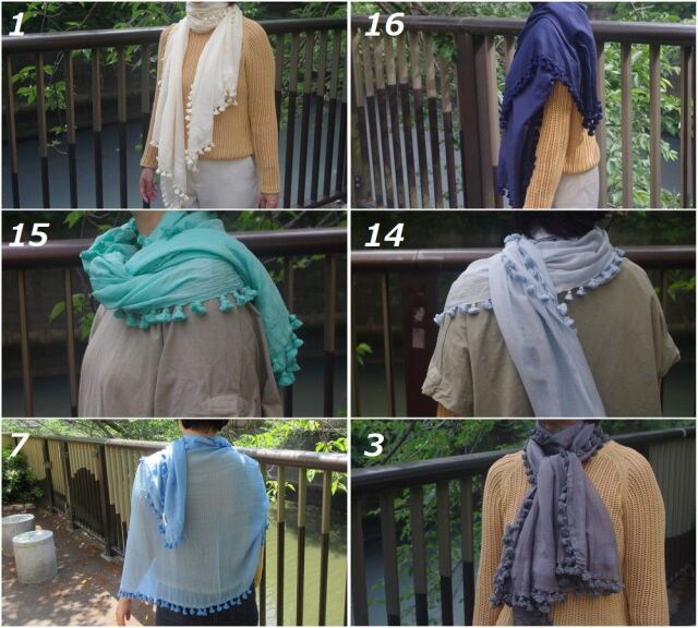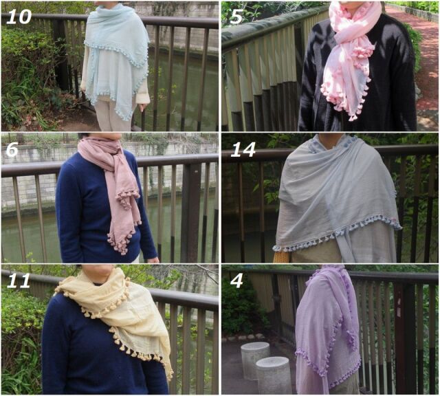 22年春夏は、ポンポンが全ての端に付くのではなく、短辺の2サイドのみに付く新型になります。素材も、シルク50%、コットン50%で非常に軽く柔らかい仕上がりになりました。