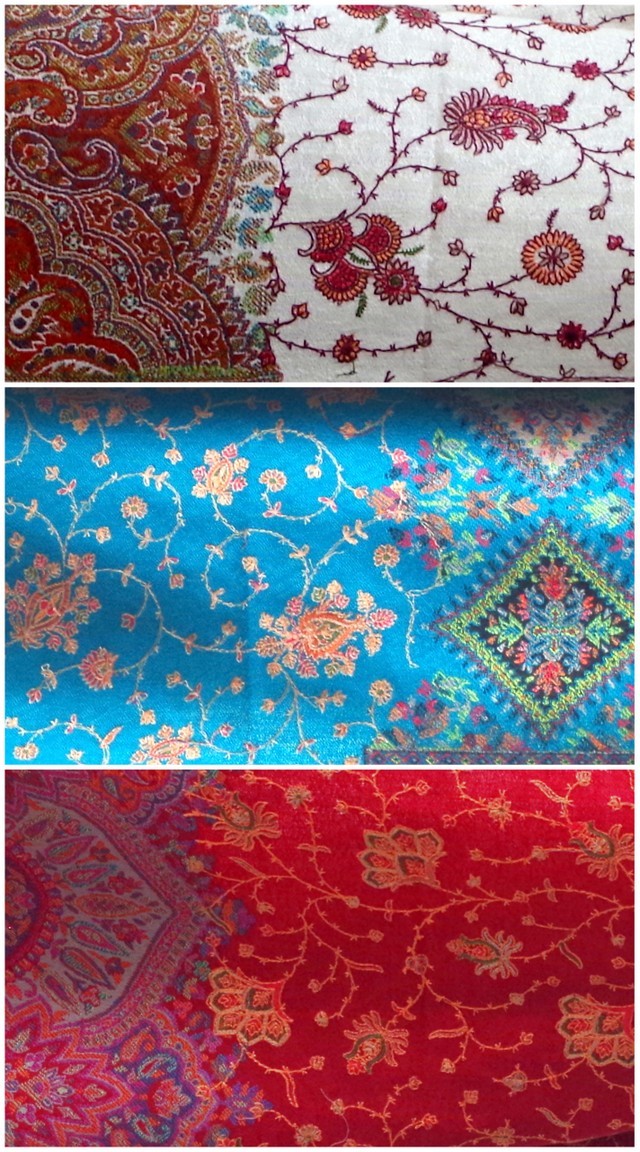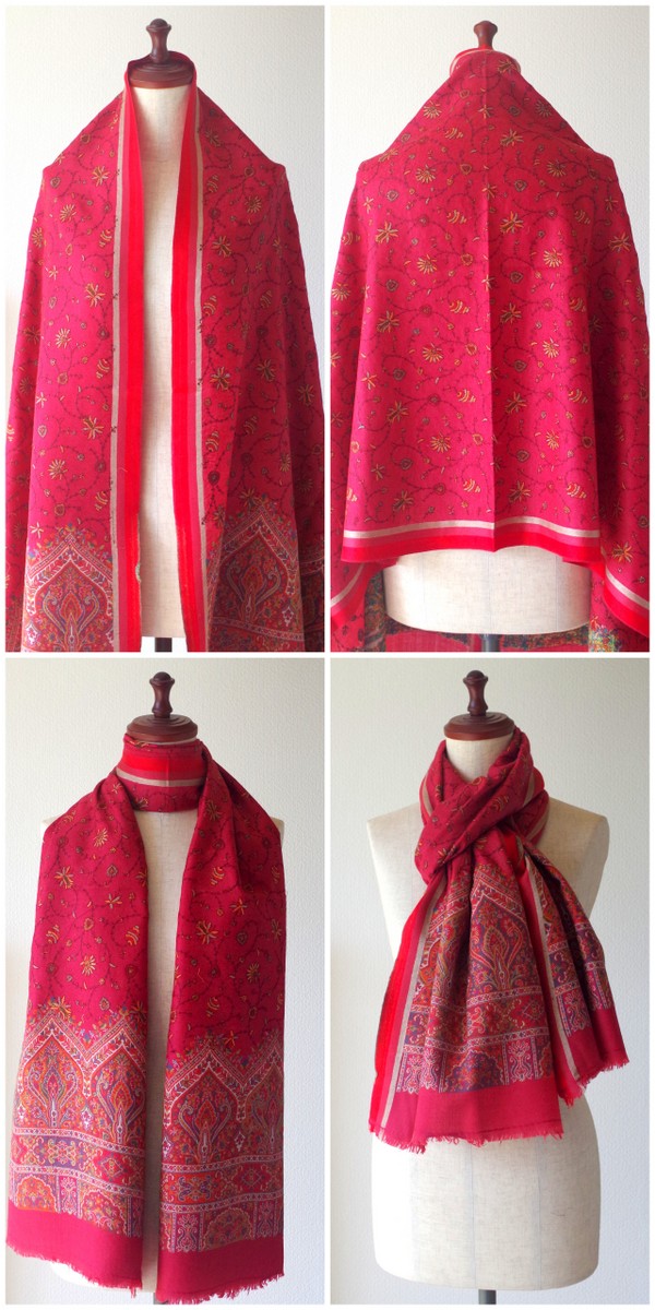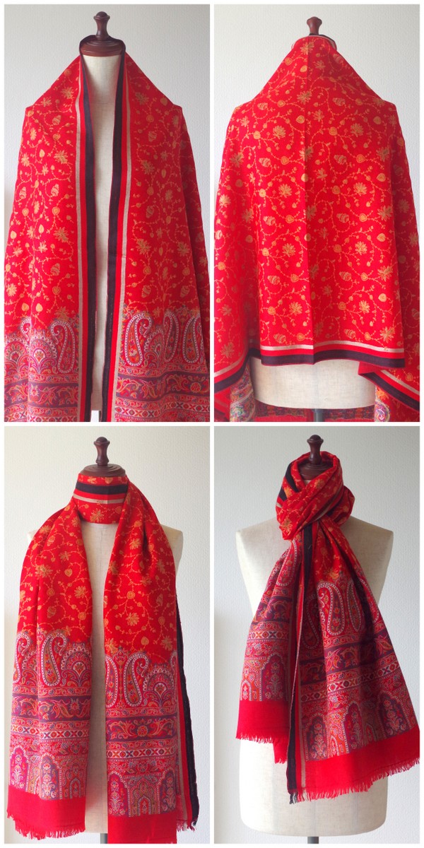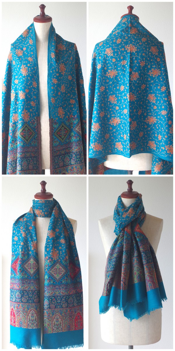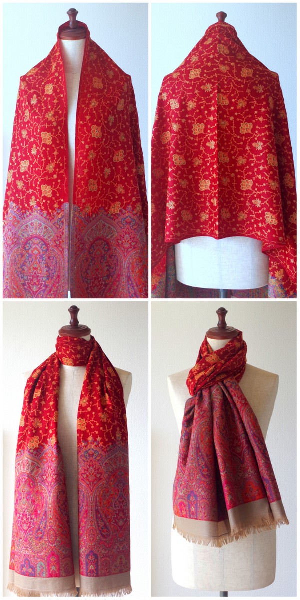 シンプルな洋服に、このような伝統的なペイズリー・フラワー柄の華やかなストールを羽織るだけで