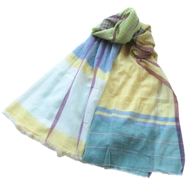 もう1枚は、ブルー(青)・ライトブルー(水色)・ライトグリーン(黄緑)・イエロー(黄色)・ブラウン(茶色)がうまーくストライプ・ボーダーで配色された、寒色系のインド綿ストール。