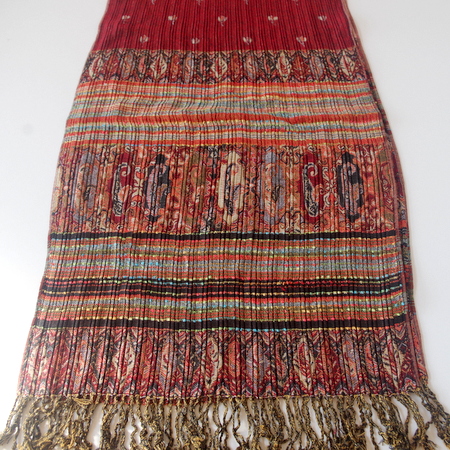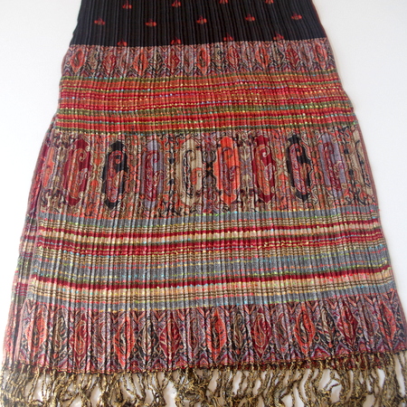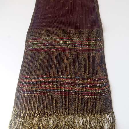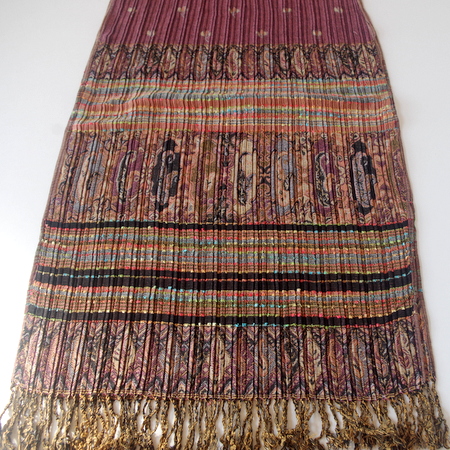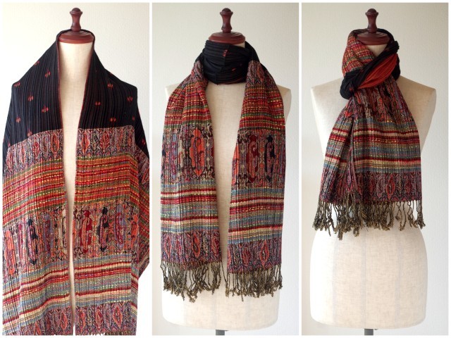 エスニック柄のプリーツ仕立てで、サイズも42センチ幅で首にまきやすい!です。