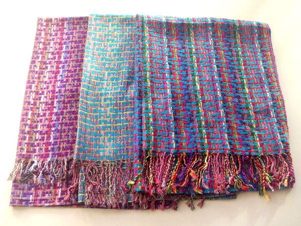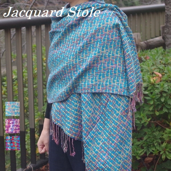 色は、パープル、ブルーグリーン、ターコイズの3色。いずれも、ミックスカラーで鮮やかな色合いです。誕生日のプレゼントやクリスマスのギフトにも最適なパシュミナタッチのエスニック柄のストールです。