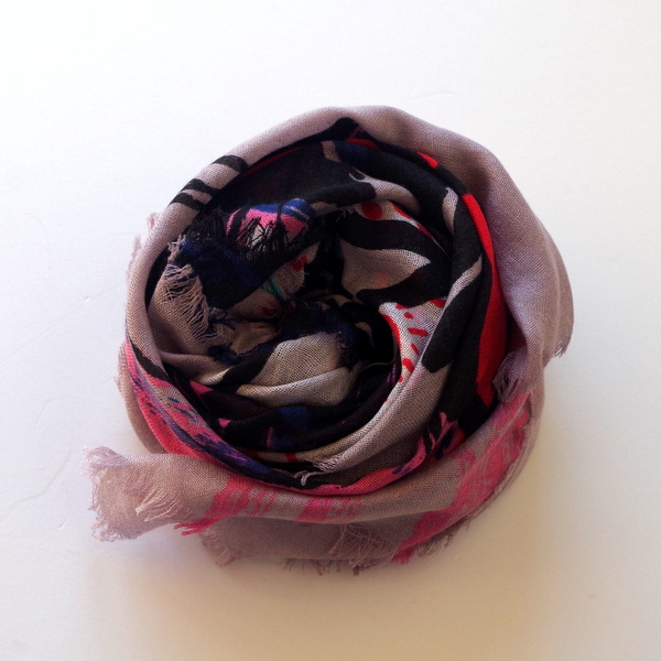 ビビッドなプリントのストールがいっぱい。思いっきり色を楽しんでお出かけしたくなる、そんな気分になります!