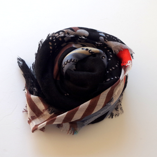 1枚あると便利な色合い、しかもYARNZらしいアイロニーが効いた大判スカーフはおすすめです!