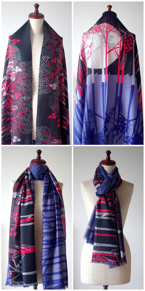 1枚のストールに、異なる色使いの為、ショールの巻き方で色や柄の見せ方のバリエーションが広がります。