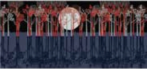 縦半分に区切られて、真っ赤なと真っ黒の木々が月夜に照らされるイメージと静まりかえったブルーな木々。
