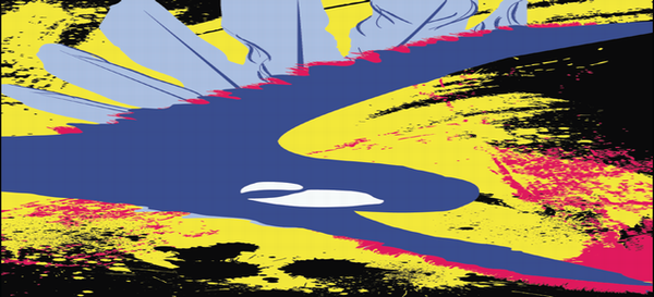 黒・黄色・ピンクの原色のスプレープリントのバックの中央に、ブルーに白のクチバシのインコが描かれています。