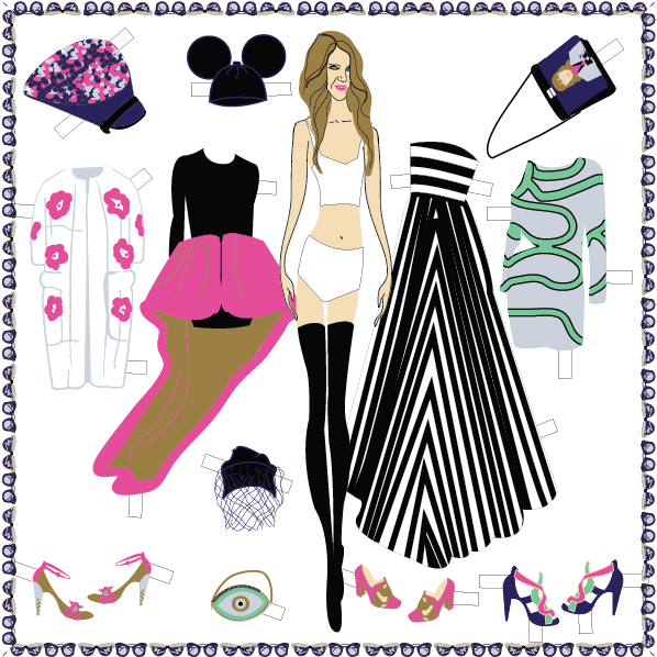 ナチュラル色のアイボリーにピンクやブラックがアクセントで。ふちに描かれているのはメガネ・サングラス