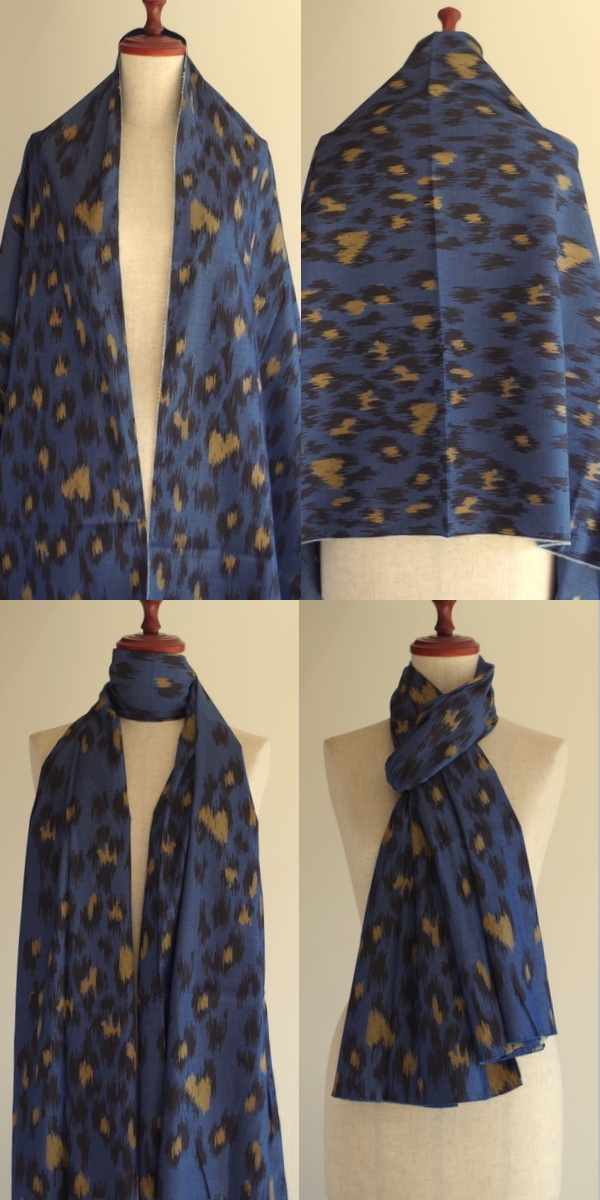 素材や柄にこだわりをもっています。一見すると藍染のようなヒョウ柄。ネイビーでも色落ちしたような色合いです。